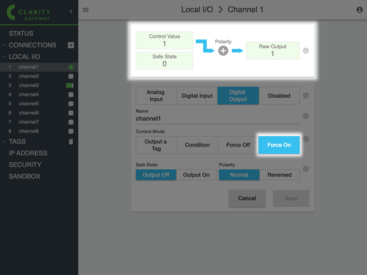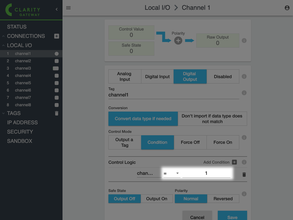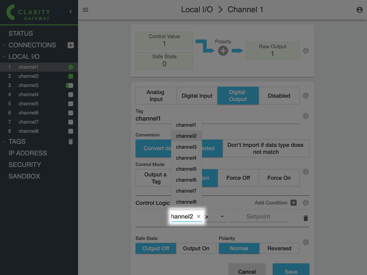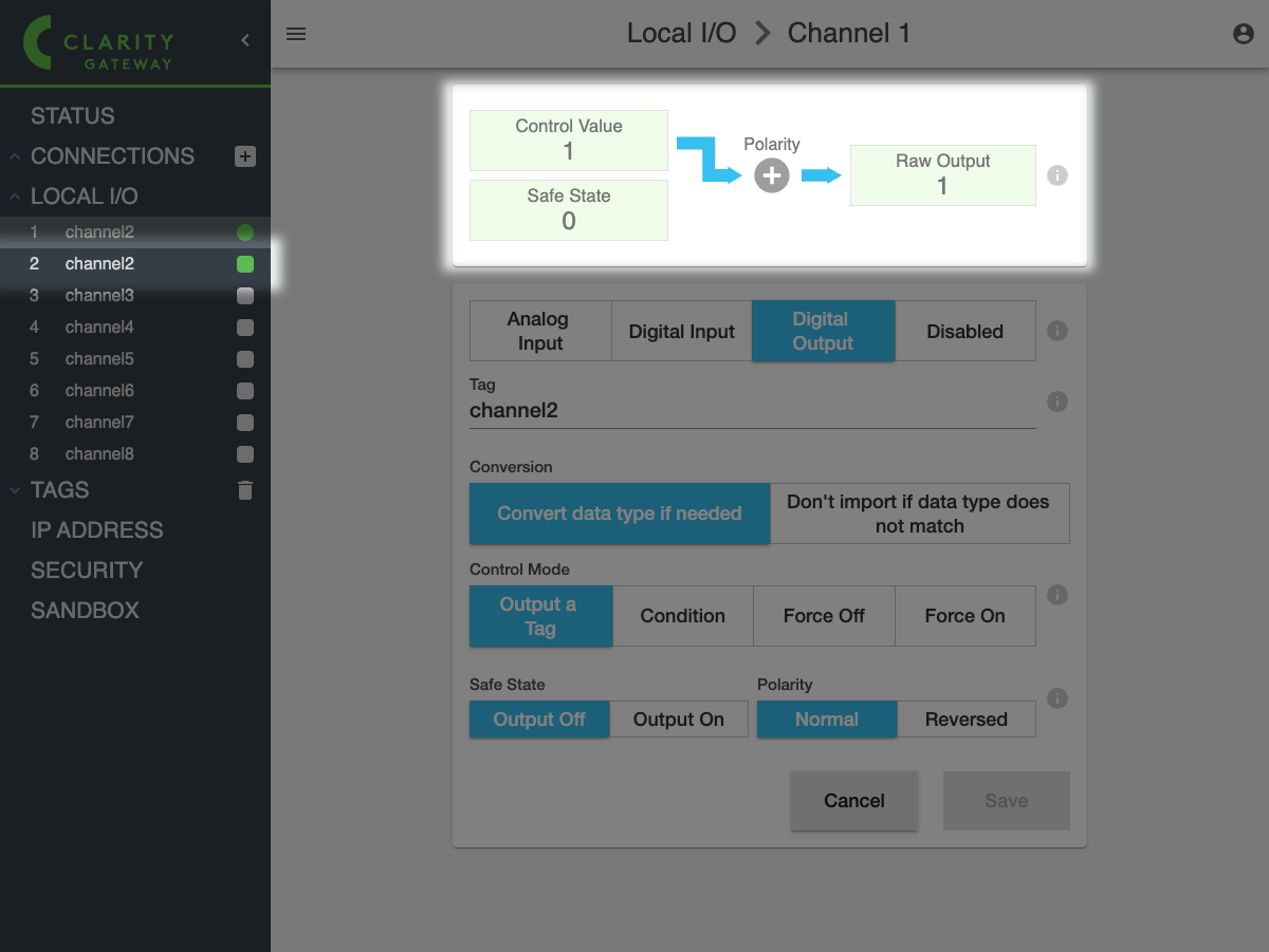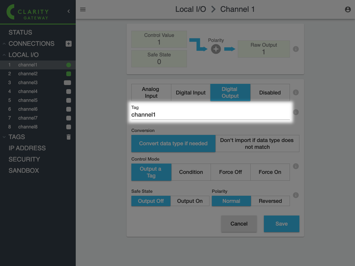Let's configure Channel 1 to output the **channel2** tag, which is currently being set from Channel 2, which is configured as a digital input in this example. Go back to the settings for Channel 1 and change **Tag** to **channel2**: