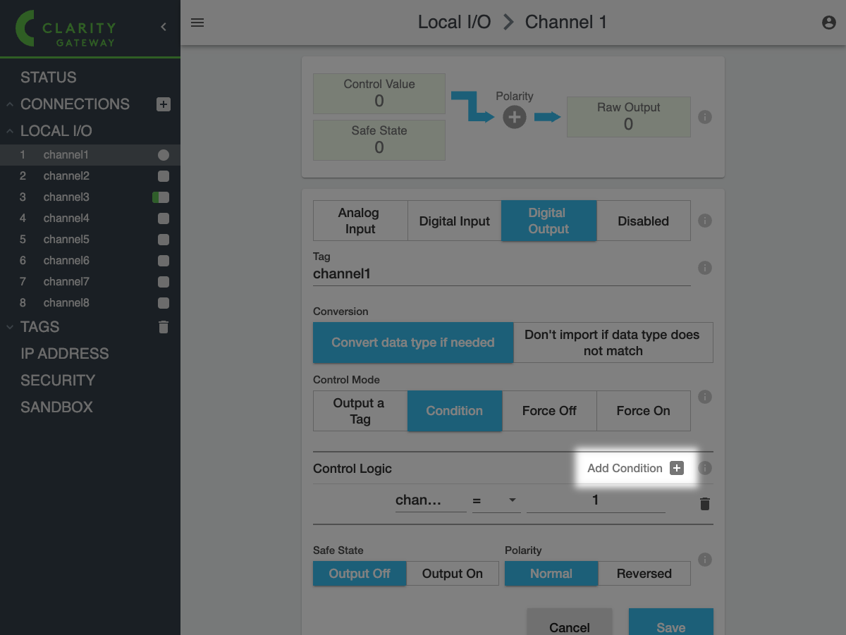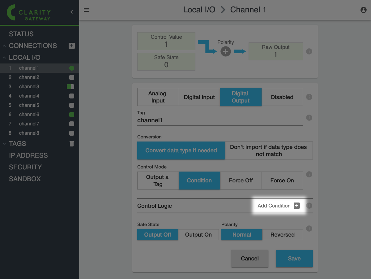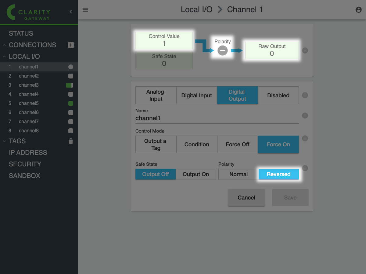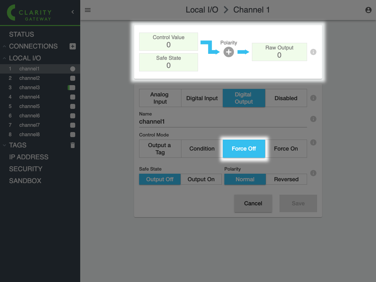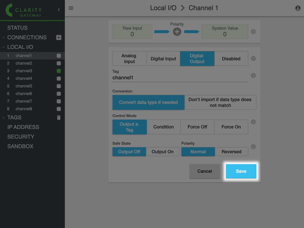 Let's configure Channel 1 to output the **channel2** tag, which is currently being set from Channel 2, which is configured as a digital input in this example. Go back to the settings for Channel 1 and change **Tag** to **channel2**: