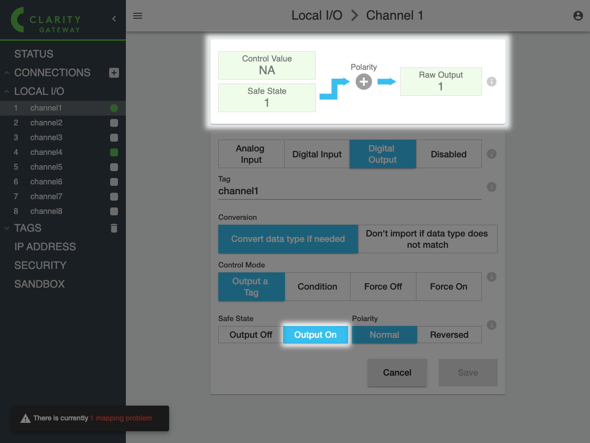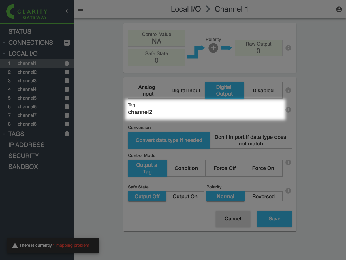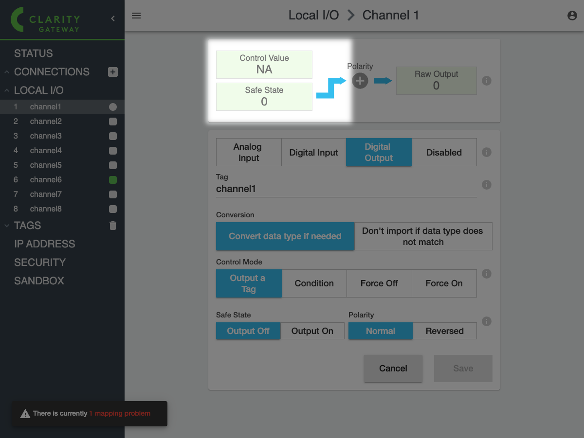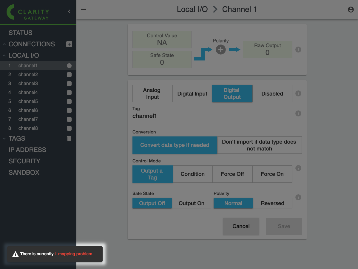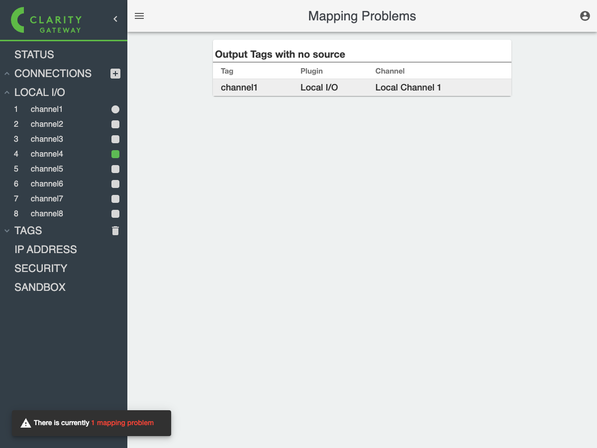 This is because there's currently no source for the **channel1** tag, which is why Clarity Gateway reports **There is currently 1 mapping problem:**