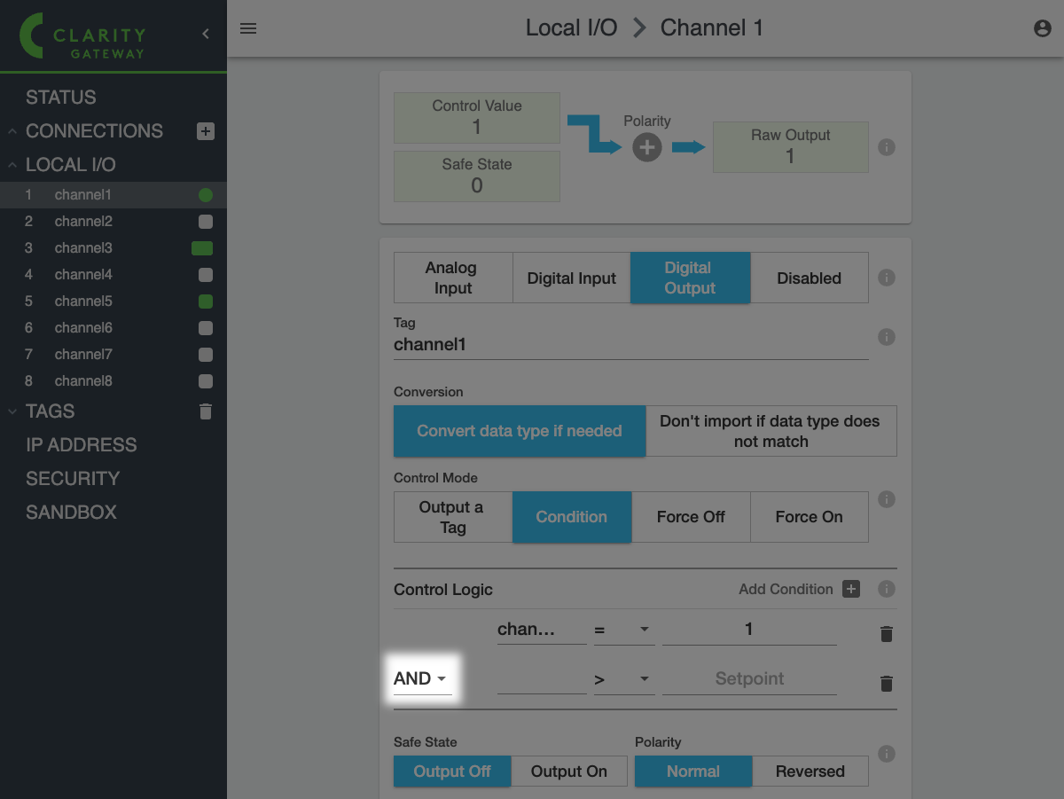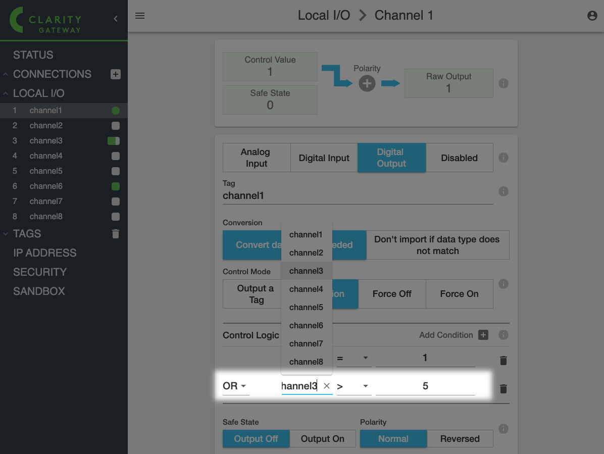This control mode allows you to use boolean logic on other tags to control the output value. For example, let's say **channel2** is a digital input, **channel3** is an analog input, and we want to output **1** when **channel2** is **1** or **channel3** is **> 5**.