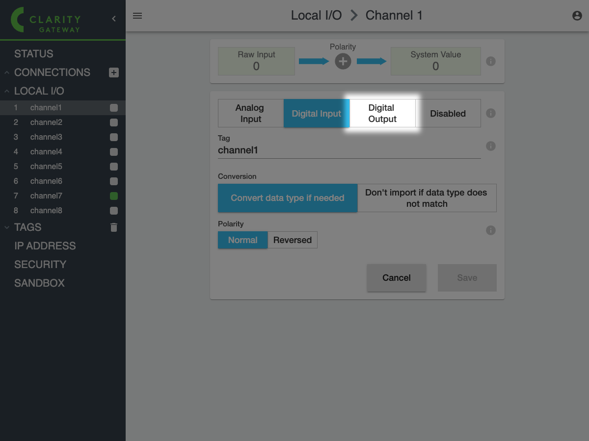 To make a Local I/O Channel operate as a digital output, first click the channel in the sidebar to go to the channel settings view: