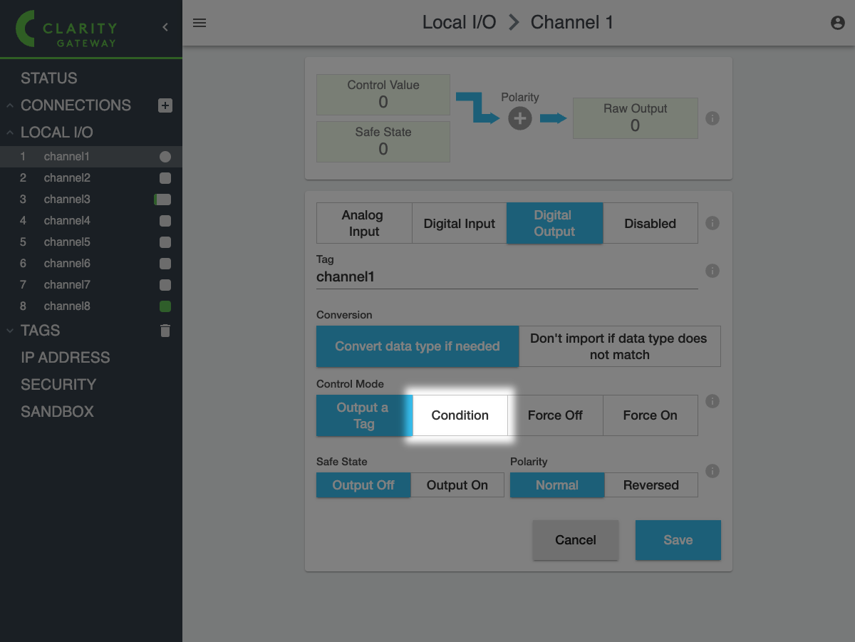 First make sure **Tag** is **channel1**. The value determined by the condition will be written to this tag:
