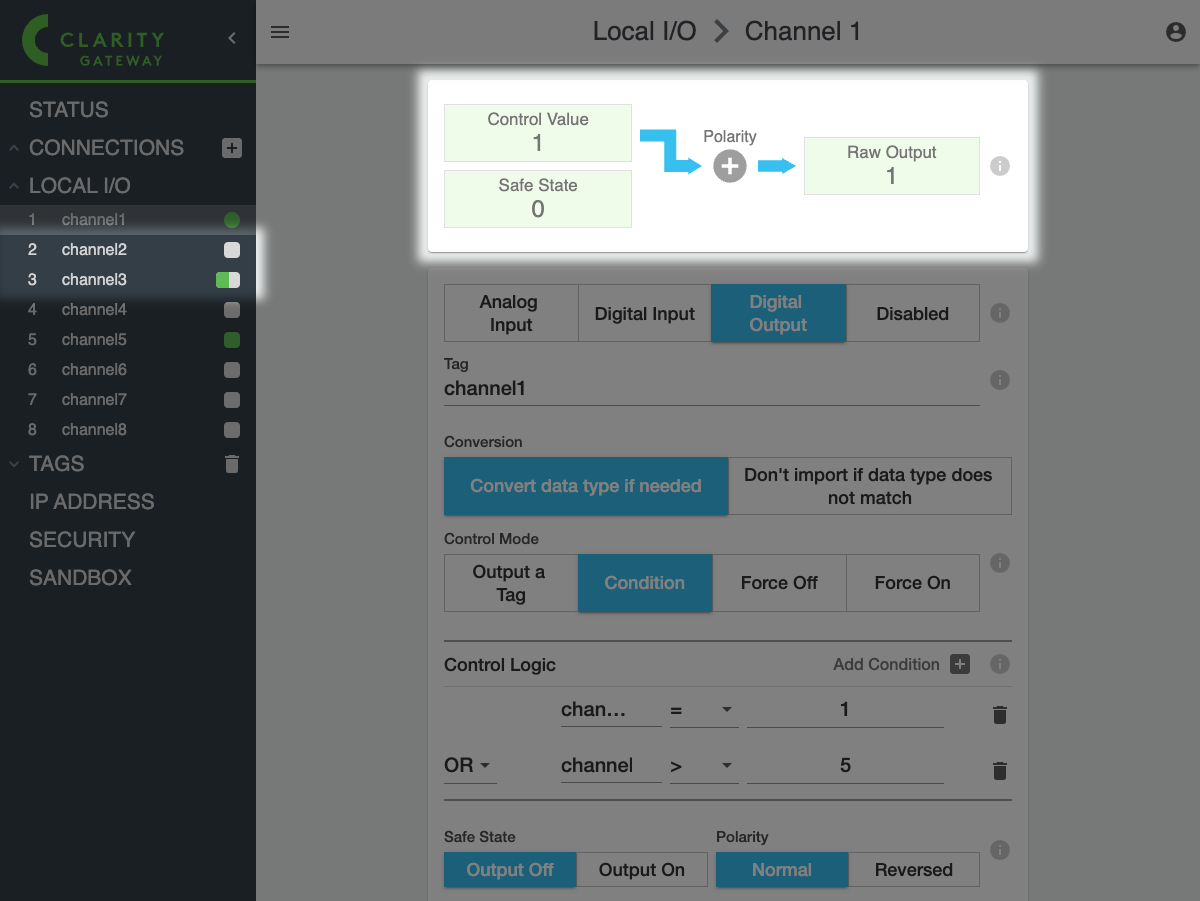 Then click **Save**. After you do, you should see the arrow leading from the **Control Value** to the **Raw Output,** and **Raw Output** should have the same value as **Control Value**, which corresponds to the state of Channel 2 in the sidebar: