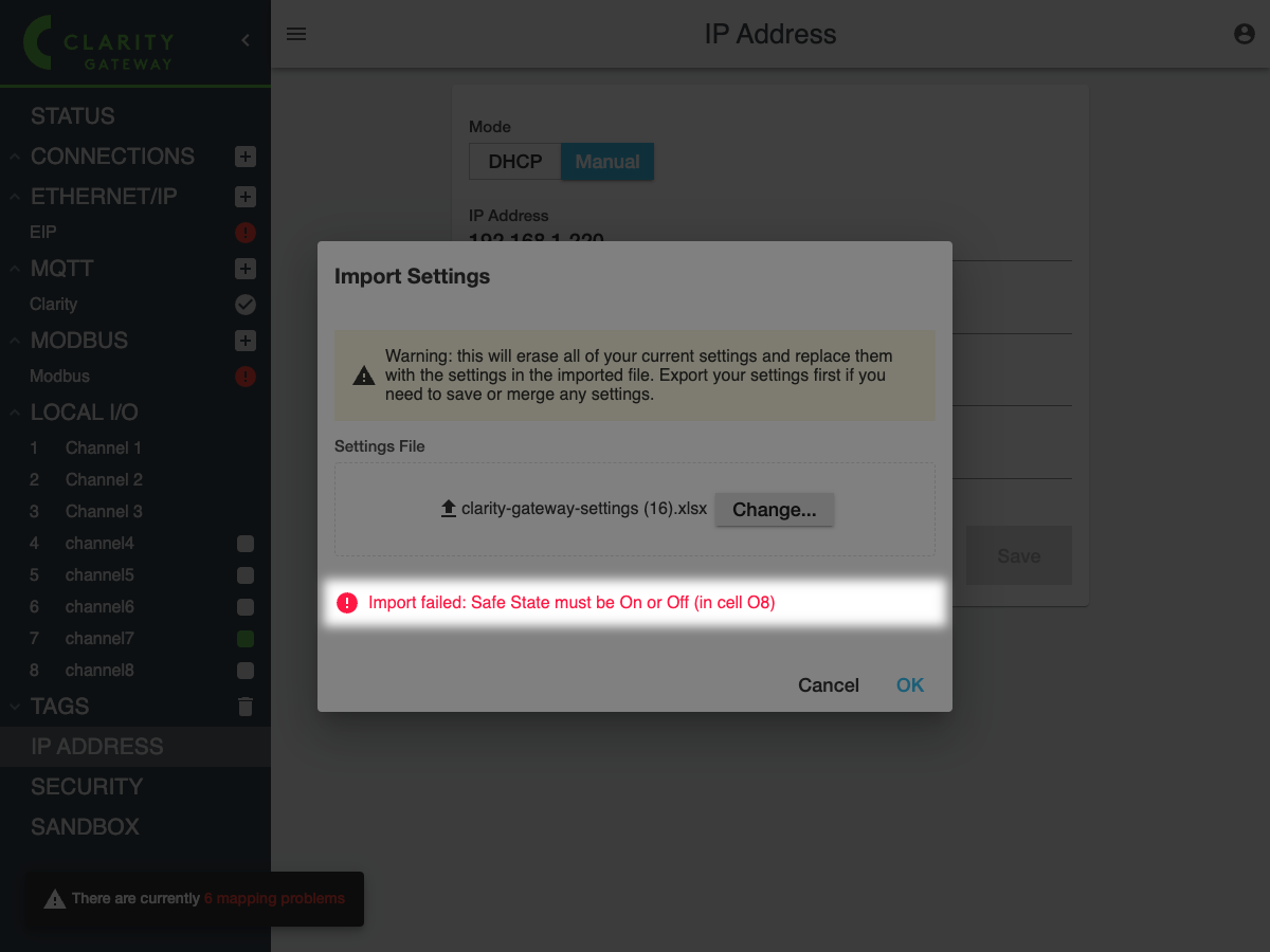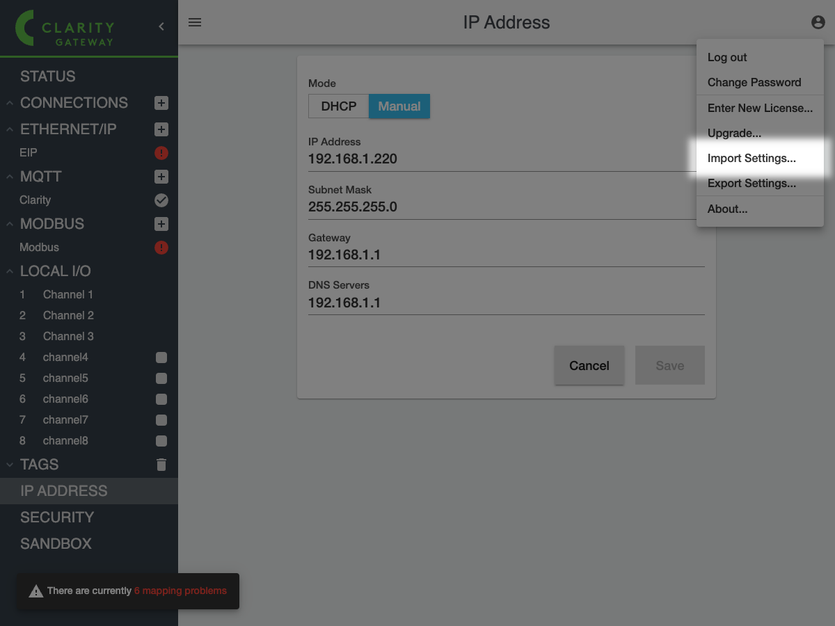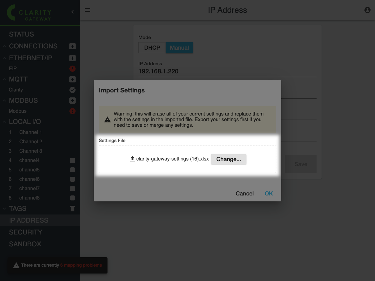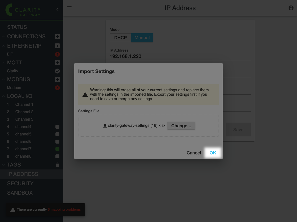 Finally, click **OK** to import the settings. Once Clarity Gateway is finished importing it will refresh the page and you should see the new settings.