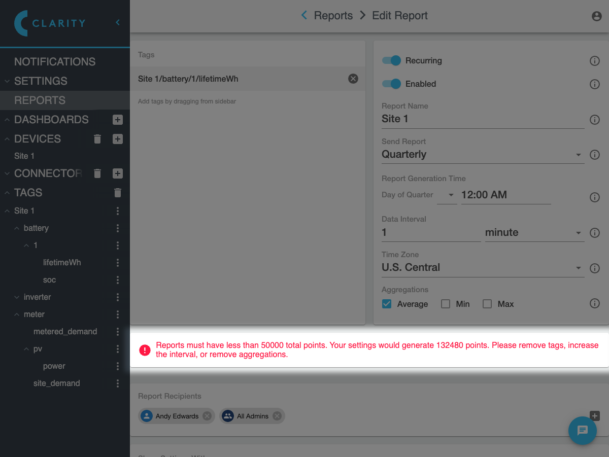 It's possible that the recurrence interval, data interval, aggregations, and tags you've selected would make the report too large. If so, you'll see this error: