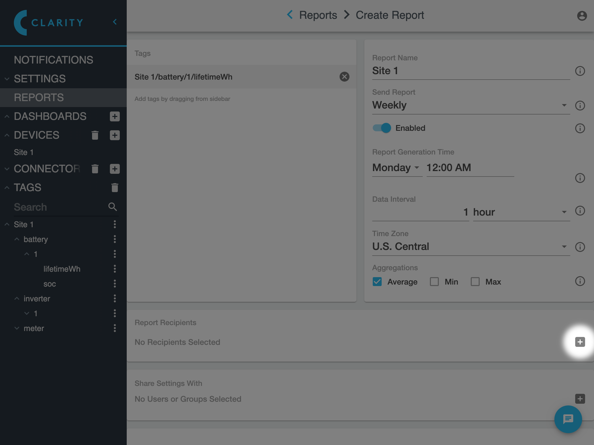 To select email recipients, click the **+** button in the **Report Recipients** panel: